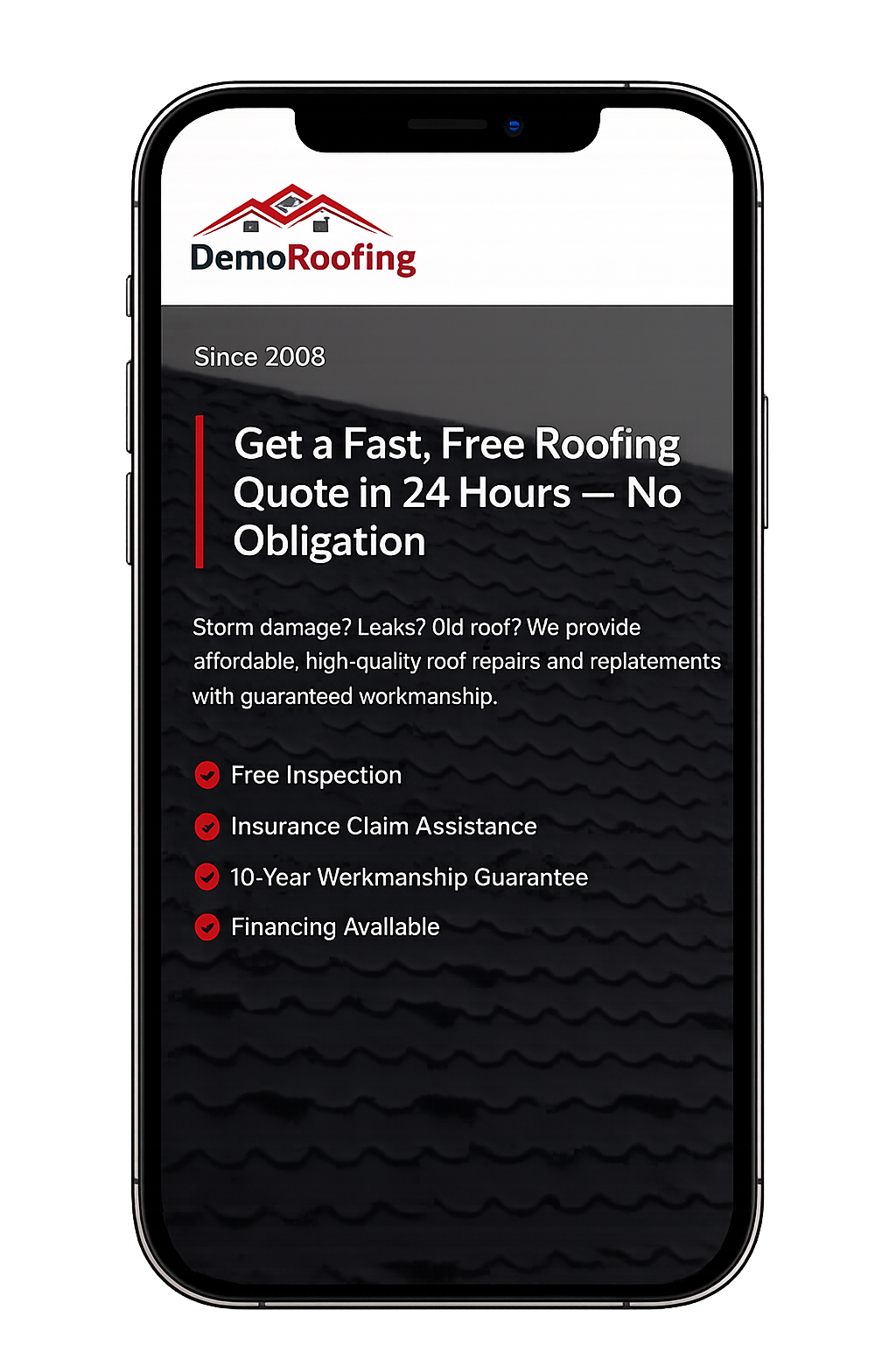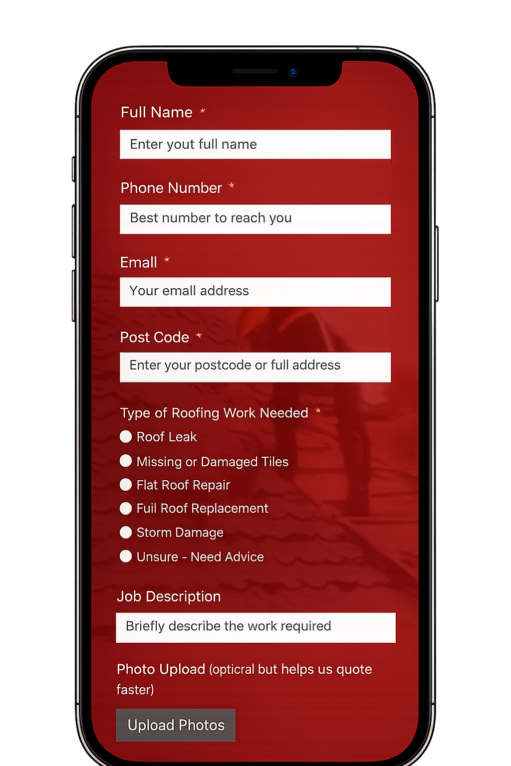 Capture roof repair and replacement enquiries with all the details you need to quote properly. Customers can submit photos, job descriptions, and location details in one structured request.