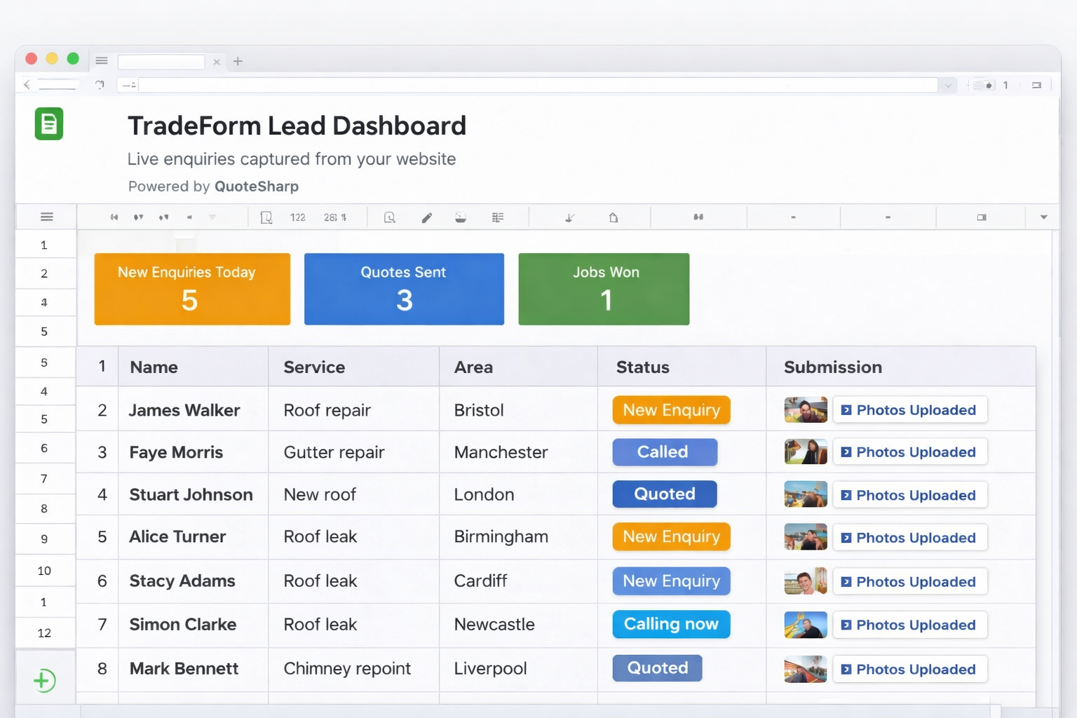 Every enquiry is automatically organised inside your TradeForm dashboard. No more lost leads or messy inboxes.